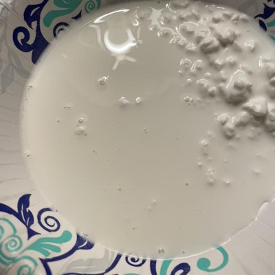 When I pulled the flap of the inner seal, it resulted in milk splashing out!! Some of the milk landed in a nearby bowl (see pic) but more went on the placemats, down the table legs, and all over my clothes. I ate a couple of spoonfuls of what did NOT spill, but the curds are small and hard-ish. Nothing like any 4% I've ever had. And what's the deal with SO. MUCH. MILK.