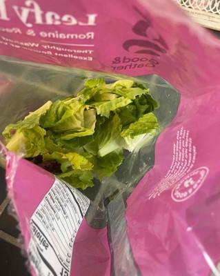 This is a perfect size bag of leafy romaine lettuce to make a salad with. There is a variety of lettuce colors in the bag, which made the salad very flavorful. The lettuce is fresh and remained crisp in the fridge for several days. It is very convenient to have the lettuce already chopped and ready to prepare. I received an incentive to write this review.