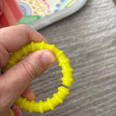 Broke after about a month. Dangerous for babies because of the jagged edges after breaking. My kid doesn’t even have teeth, how fragile is this toy that a 7 month old can break it.