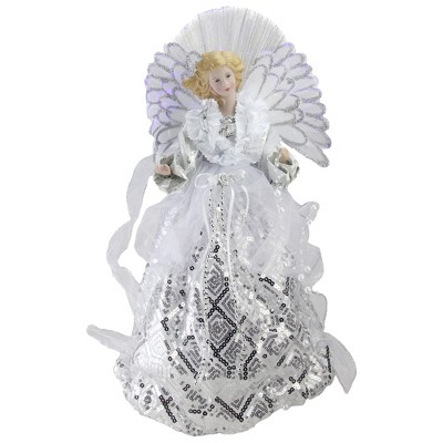 Large gold sequins embellish her collar and bodice Features stiffened white wings trimmed with gold, outlined in fiber optics Under her dress there is a plastic cylinder attached to help her stand atop a tree or table Topper is so versatile that it can also be used as a tabletop decoration Additional Product Features: Constant color changing fiber optic wings