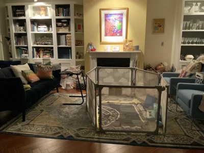 Like this for keeping 18 month-old in a larger space than pack-n-play. Mesh is sturdy and easy to set up as well as transport to nana’s. Placed cushioned floor mat underneath for additional protection. Issue is that even with locked joints, baby is able to move around and is needed to be enclosed with surrounding furniture pieces. For as much as it costs, it shouldn’t be able to “reshape” when child pushes on it; defies its purpose.