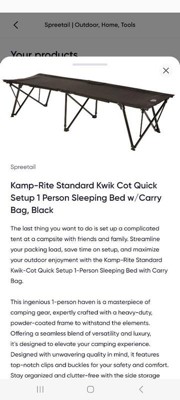 Kamp-Rite Standard Kwik Cot Quick Setup 1 Person Sleeping Bed with Side Storage Pockets, Storage Hammock and 600D Carry Bag, Black