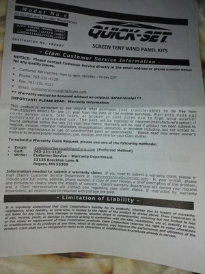 [This review was collected as part of a promotion.] Clam quick set scream hub tint wind and Sun panels go on quick are durable great for letting the air in but keeping the rain or moisture out with a four-point attachment you won't have a problem. Great durability and a great value