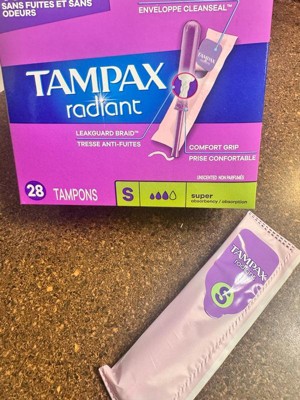 Tampax Radiant Super tampons are comfortable and reliable, has good absorbency and easy to insert. Sometimes the string feels a little short.