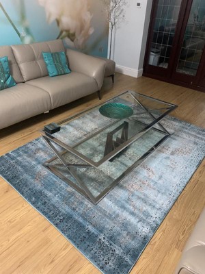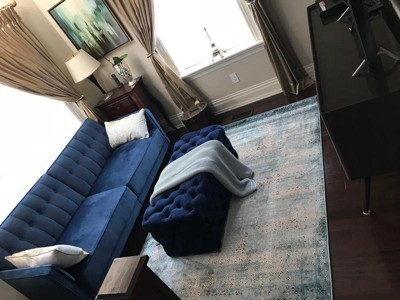 Bought to replace brown/sand rug in entrance to home. Dramatic difference; subtle blues really add color to room. Very soft, kids love it!