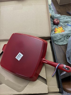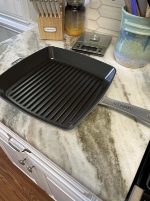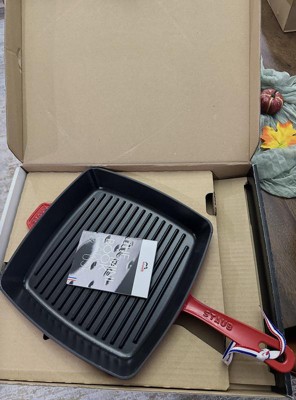 Great sized grill pan. Best grill marks, better than a barbeque. Staub is perfect for indoor grilling. No seasoning required, and cast iron heats evenly, and maintains heat. We use this pan several times a week, for chicken, beef, pork, fish and vegetables. Easy clean up. Learned to place oil on the food, not on the pan. This method prevents sticking and keeps spaces between the grids mess free. Also oven safe, so I often start thick pieces of meat on the cooktop, and finish cooking in the oven, just like the restaurants. Great for spatchcock chicken too.