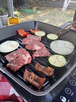 [This review was collected as part of a promotion.] We are using our 12” cast iron grill pan on our portable induction burner for outdoor Korean bbq. It’s been incredible. Seers and cooks meet to perfect tenderness and great flavor. Clean up is a breeze. Can’t wait to try the grill press we purchased with it.
