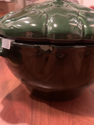 The artichoke design is meticulous from the perfect green color, lid design, curves in the base, down to the cute little handles. Don't be misled by the cute design; this little guy can be a work horse. It has amazing Staub features like the beautiful, chip resistant enameling on the outside. It also has the black interior that doesn't require seasoning, browns beautifully and cleans up easily. My first thought would be serving a party dip. Perfect because it holds its heat so well. But its 3 qt size would also be ideal for soups, stews or even baking bread.