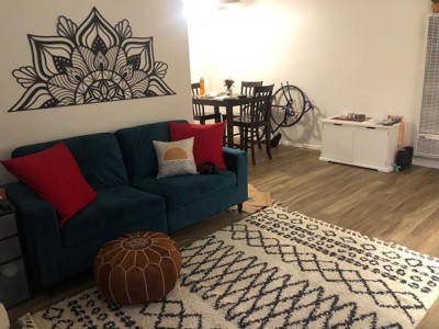 We got the 2’x4’ rug for our laundry room, and it’s perfect in the space! The tassels do take some time to flatten out, but it’s a great rug nonetheless.