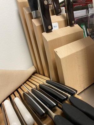 Love the color and design of this modern block. The white wash looks great in a white kitchen. The unique block holds 10 knives with strong magnets.