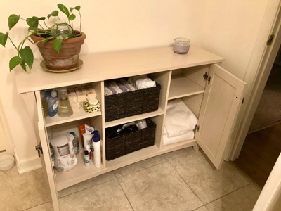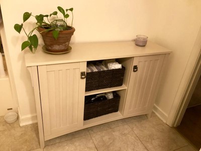 I searched through the dimensions of many stylish storage pieces on different websites to find something I liked with a 13 inch or less depth, the right length and cabinet doors. This has been a perfect option in the bathroom for towels, hair tools, soaps and bottled lotions. The shelves inside the cabinet doors are adjustable. It is definitely a warmer toned white color but looks great in my mostly neutral bathroom with grays and cream. I used two dark brown sturdy baskets in the open storage area. My husband and I put it together in 1 hour 25 minutes. The directions were easy to follow and all the parts were there. It really makes the bathroom less cluttered looking and it's easier to get ready every day with things more organized. We are very happy with it