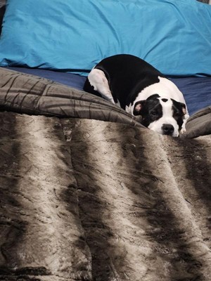 [This review was collected as part of a promotion.] This is an amazingly warm comforter! Living in Florida I won't quite need this in the summer but when it cools down here and hubby is loving it, I also will be loving in with this warm and incredibly soft blanket! There are matching pillow shams and a little throw pillow. My dogs instantly steal little pillows. As you can see my pup enjoys this a whole lot as well! It is so soft! I like the color! It's great!