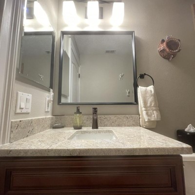 Beautiful mirror. Well constructed. I love the beveled glass. I’m giving 3 stars because I ran into issues installing. It has 2 D rings close to the edges. Instructions big and bold DO NOT USE PICTURE WIRE TO HANG. You are supposed to measure out perfect alignment and hang from these D rings using YOUR OWN screws and anchors. However, the placement was such, one D ring was in front of an electrical line. I couldn’t install an anchor, nor move the mirror to avoid. Frustrating. I wish they had alternate mounting methods. I ended up using 3 strand of picture wire and 2 picture hooks (good for 30# each) spaced 6” apart. It’s been 2 weeks and still going strong! You may want to consider having a handyman install. The 3 stars for design was mainly for design of mounting. There’s got to be a better way. I think this may be a bit too big for the space ( 30 wide cabinet. mirror 29.5 )