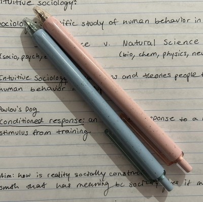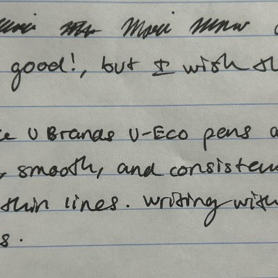Overall, I’d give the U Brands U-Eco pens about a 3.5 out of 5. The ink is dark, smooth and consistent, with no skipping, and it lays down clean, thin lines. Writing with them actually feels nice, especially for longer sessions. The biggest drawback is how fast the ink runs out. One pen lasts roughly 15 pages for me, though that’s just a rough estimate since I take a lot of notes and journal pretty often. Even when I rotated between multiple pens, they were already running dry by the end of first quarter. The barrel itself is cute and feels sturdy, but the short ink life makes them pricey to keep replacing. If you care most about smooth writing and aesthetics, these are a solid choice. Just keep in mind that ink longevity might be an issue.