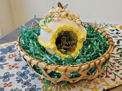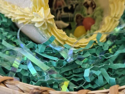 This is a pretty Easter grass! It's a medium green color in a combination of paper crinkle shreds and iridescent mylar strips. It's just a bit different and pretty! I plan to use it in my grandchildren's Easter baskets this year.