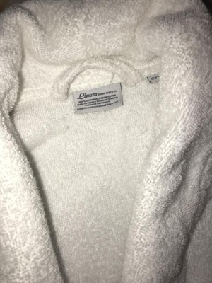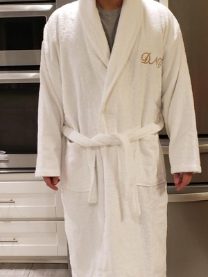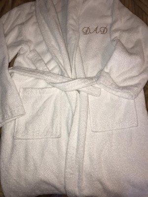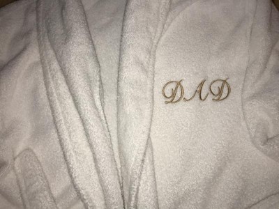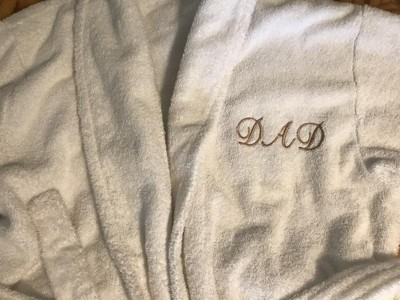 This bathroom is made out of terry cloth material and so it feels like you are wrapped in a big fluffy towel. It is not necessarily soft to touch, but it is comfortable. The white color is very classic and the word Dad is subtly in gold in the corner.