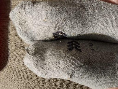 A: The socks are made from 40% cotton, 53% recycled polyester, 5% nylon, and 2% spandex.