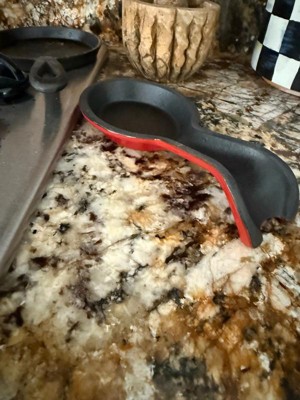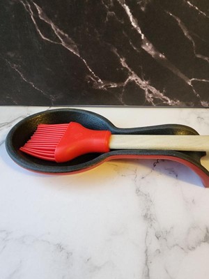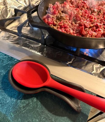 [This review was collected as part of a promotion.] This is a heavy spoon rest. I have red cooking utensils, so this spoon rest matched perfect! I do wish it was wider, because it’s only big enough to fit standard size cooking utensils . My wide spatula wouldn’t fit on the spoon rest. The spoon rest is easy to wash up. I do add a tad of oil so it didn’t rust.