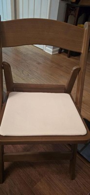 [This review was collected as part of a promotion.] I love this chair! The material blends in perfectly with my wood table and chairs, but I can choose whether to keep it at my table when guests come by, or neatly store it in my closet. The chair folds up easily and it’s very lightweight but sturdy! The seat is pretty flat, and the white is a bit risky with food, but otherwise this is a great alternative to a metal folding chair!
