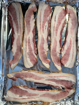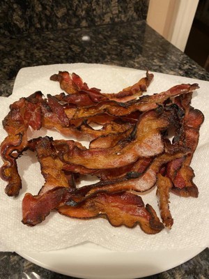 Pros: This bacon is really delicious!! It actually tastes like bacon (some brands definitely don’t) & has a really nice smoky flavor. You will smell it throughout your house, everyone will follow their nose to find this bacon. Cons: The bacon is super thin, it has the thinness of a cold-cut sandwich meat from the deli. It took me a really long time to separate each piece to cook. I had to delicately pry each piece apart to keep them from totally ripping to shreds. This was really frustrating & time consuming which is why I removed stars from my review.