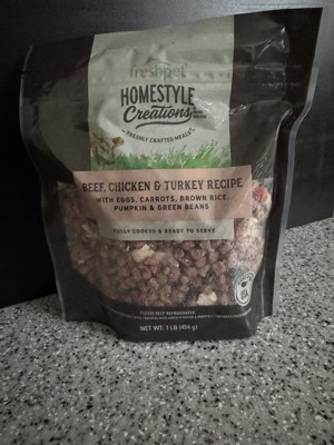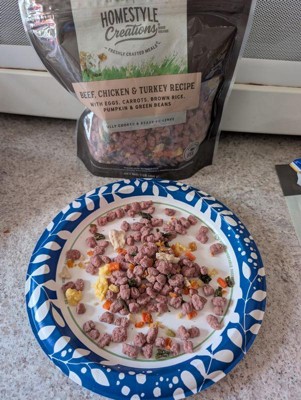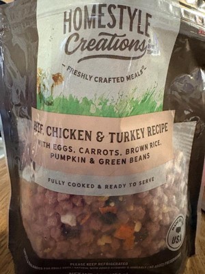 [This review was collected as part of a promotion.] I recently tried the Homestyle Creations Beef, Chicken & Turkey recipe for my dog, and overall I was pretty impressed. My dog already eats Freshpet (just a different variety), and she absolutely loves it so I wasn’t surprised when she ate it right up with no hesitation. I like that it's made with real ingredients like eggs, carrots, brown rice, pumpkin, and green beans. It looks fresh and wholesome, and you can actually see the different ingredients mixed in. One thing to note is that the pieces are very small so it might be better suited for smaller dogs. For larger dog, it might not be as satisfying or could feel a bit tedious unless you're mixing it with something else. Overall, I'd recommend it, especially if you have a small dog or are looking to switch up your dog's fresh food options. It's a nice variety, and my dog clearly approved.