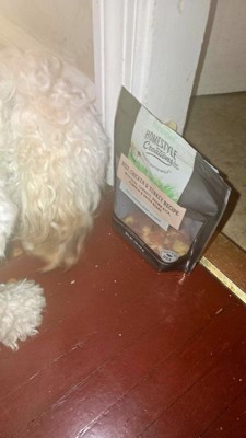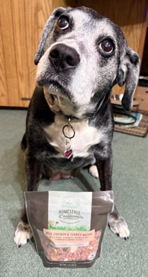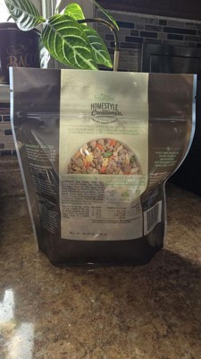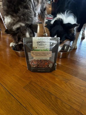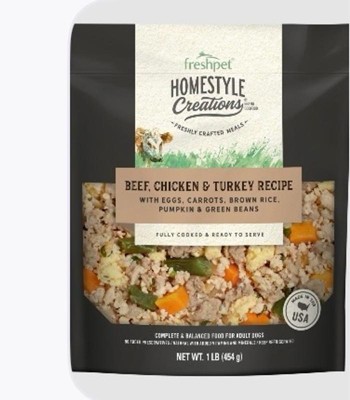 [This review was collected as part of a promotion.] Freshpet Homestyle Creations is a big hit with my three dogs. I've never seen them get so excited for feeding time. It looks and smells great. The packaging is an easy open and close bag. Highly recommend for your furry friend.