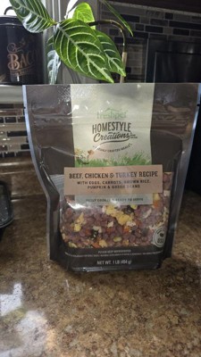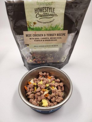 [This review was collected as part of a promotion.] My dogs absolutely loved homestyle, creations, beef, chicken, and turkey recipe. They definitely could not wait to eat this fresh pet food. There is also other great fresh ingredients included like eggs, carrots, green beans, pumpkin, and brown rice. this fresh pet food is fully cooked and ready to eat.