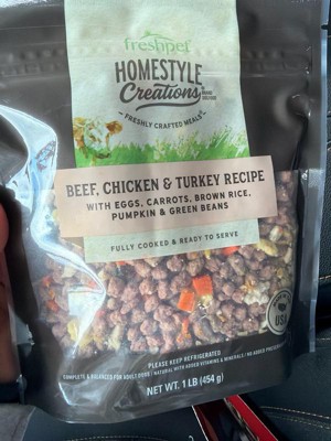 [This review was collected as part of a promotion.] My Pomeranians loved the Freshpet Home style creations beef, chicken & turkey recipe meal. It looks like it was home cooked. There are bits of turkey, chicken and beef along with carrots, green beans and eggs. Looking at the list of ingredients beef, chicken, turkey and eggs are the first listed. No artificial ingredients. Only vitamins and minerals along with flavorings you would use in home cooking. The 1 pound bag will feed my poms for several days making it affordable for pet parents looking for healthy meals for their fur babies. Jelly Bean and Sentry give it 5 paws.