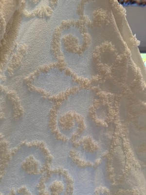 I was happy to find a chenille bedspread on sale. The bedspread is not a true white, more of an off white. It is thinner than other chenille bedspreads I have had, but it cost less than the others I have had. It works for me.
