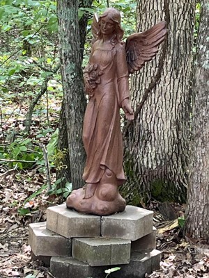 We received our angel today. She's very nice but does not look like the picture. She is much more of a terra cotta pain finish with just a little blacking -- she does not look as though she has a rust patina. We're going to keep her but I was quite disappointed. She will sit on a large rock at the bottom of the our stairs leading up to the house. I'm still looking for an angel that would be better. My husband is ready to send me to live with the angels. . . . ;)