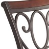 This swivel counter stool from Kensington Hill provides a rustic yet elegant look. It comes in a glitter bronze finish over a metal frame and has brown faux leather upholstered seating. What really sets it apart is the openwork back frame in a swirling design of scrolls and ovals, with a poplar wood accent running across the top.