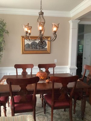 It is a beautiful chandelier. It is unique that goes very well with the farmhouse style.