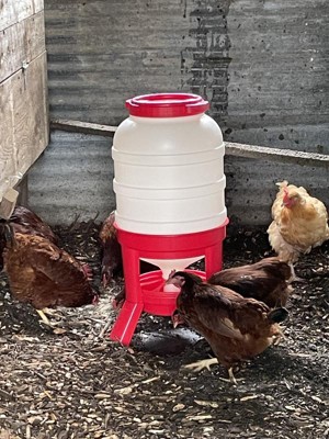 [This review was collected as part of a promotion.] I had a homemade feeder made out of pvc that worked okay but would have to be refilled every few days. Receiving this feeder was a game changer. I can dump a 40lb bag of feed and not worry about it for weeks. It less work for me, keeps the feed cleaner by blocking this chicken from climbing or pooping in it, and it’s low maintenance. I’d highly highly recommend if your have a more than a couple chickens.