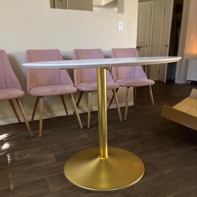The table looks nice and was exactly what I was wanting but assembly is proving to be more difficult that I anticipated. Step 2 where you tighten the base to the leg of the table seems to come with tools that make it harder to do the job. I would recommend adding several washers yourself on that step to add stability for the table. I’ve have been at it for a good hour but it still leaves the base of the table wobbly because it is harder to twist and get it completely down without injuring yourself. Seems like I will have to do some rigging to it in order for it to be useable and steady which is unacceptable considering the price point which at the time I purchased was $126. There was also cracking at all 4 points when screwing the base onto the stand and even with the top on it was still wobbly. I don’t have time to fix it now but hopefully I can find a way to tweak it and leave an updated comment for anyone else who still wants this table. Its a steal for a small space considering most in this style are over $400 somehow.