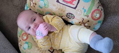 My baby didn't love this. It didn't fit on her hand well and she couldn't really get it to her mouth since it was so big
