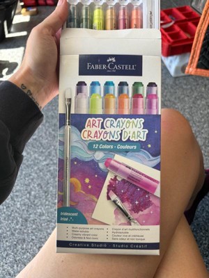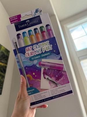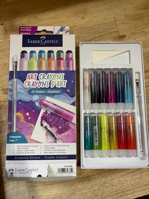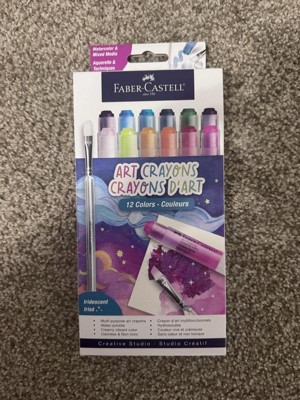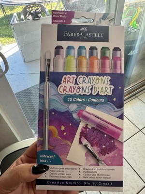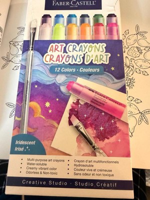 [This review was collected as part of a promotion.] These Faber-Castell Art Crayons have quickly become a staple in my creative toolkit, offering a fantastic blend of ease-of-use and vibrant color . The set of 12 iridescent colors is truly a joy to work with, especially when adding shimmer and highlights to mixed media pieces. They glide onto paper with a lovely creamy texture, which makes blending smooth and almost effortless, a big plus for both quick sketches and more detailed work. I particularly appreciate that they are odorless and non-toxic, making them a great choice for longer art sessions without any harsh smells. What really sets these crayons apart is their multi-purpose functionality, particularly when used with water. Applying the color dry and then activating it with the included brush turns them instantly into a bright watercolor paint, offering a cool mixed media effect right out of the box. The color intensity remains surprisingly strong even when heavily diluted, which is something I often struggle with in other water-soluble crayons. They lay down an intense, vibrant pigment that makes small details pop, but they're also forgiving enough to cover larger areas with a subtle, luminous wash. Overall, this "Creative Studio" set is an excellent addition for anyone looking to experiment with watercolor and mixed media techniques. Whether you're a beginner or a more experienced artist, these crayons are high quality, versatile, and fun. The included brush is a nice touch, too, allowing you to start experimenting immediately. They've earned a permanent spot on my desk for when I need a little bit of shimmer and light in my next project.