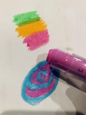 [This review was collected as part of a promotion.] I was worried these would be like pastels and messy but they have as much transfer as crayons, maybe a little bit more. They’re also water-soluble which is great for kids in case they make a mess. They’re very creamy, vibrant, and opaque. I wish where were more examples of how to use the sponge and brush.