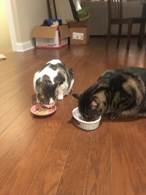 Both cats clean their dishes.