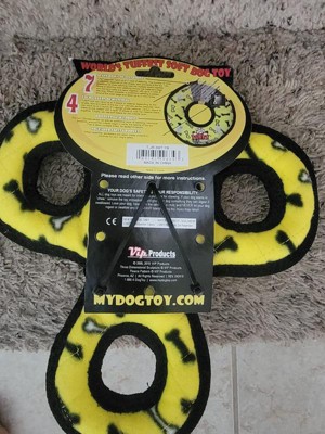 This dog toy certainly seems to be indestructible! The toy can be used as a tug toy, a chew toy or a frisbee like toy. Good for small or large dogs. Bright colors of yellow and black that don’t seem to fade. Love it!
