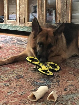 Thank you kindly for your review and purchase of our dog toy. Something to please keep in mind with our toys: Our products are not designed to be chew toys. Our toys are designed to be interactive play toys for you and your dog to play with together: tug, toss, catch, fetch, etc. If your dog starts to gnaw on the toy, we recommend replacing the toy with a safe and digestible chew option, and bringing the toy back out when your dog is ready for interactive play time. Thank you again. VIP Products/TUFFY® Dog Toys