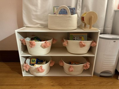 These bins are great for the kiddo’s bigger toys. Wide open so he can dig for something or help clean up. The cute tassels are more fun than the standard rope bins, and the rope doesn’t scratch our wood floors. Everybody is happy!