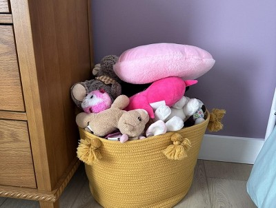 I just love this woven basket, it is so big and spacious inside. I bought it to store all my daughter’s toys inside her play area and it just looks soo pretty and fits alot of toys.