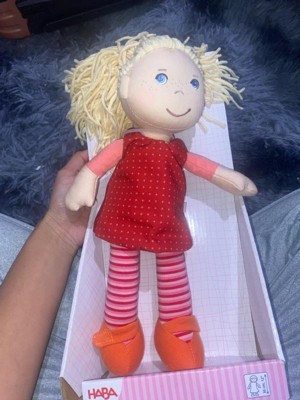 HABA 12" Soft Baby Doll Annelie with Blonde Hair, Embroidered Face, Removable Red Dress and Matching Hairband - Washable Toddler Doll for 18 Months+