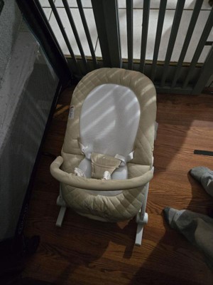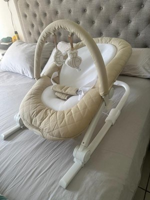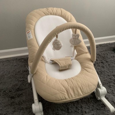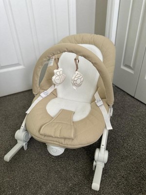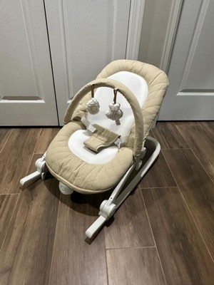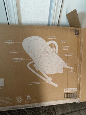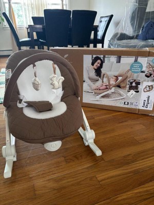 [This review was collected as part of a promotion.] It’s super lightweight, folds flat, and the design is really cute. The upright seat helps a lot with reflux, and it’s easy to clean. Not a fan of the vibration/music (they’re combined) and it doesn’t bounce or rock on its own, but nice price and portability. It works!
