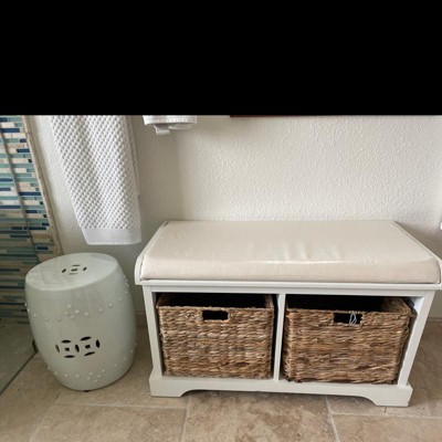 Received the distressed white Safavieh Freddy storage bench in record time and in perfect shape. Bench and baskets arrive fully assembled --yay. Ships in a box within a box with styrofoam. You will need 2 people to make unpacking easy breezy. Paint color of distressed white is as shown ie a creamy white not a stark white. Cushion is nice and firm. Great sturdy little bench, just what we wanted. Thanks Target!