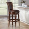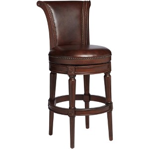 Get stylish seating with this traditional swivel bar stool. It comes in a walnut finish rubberwood frame, with handsome mocha brown top grain leather upholstery. An antique brass nailhead trim decorates the round seat and back, and hand-carved details on the frame add an elevated level of elaborate beauty. A built-in memory 180-degree swivel feature allows the seat to snap back to its original place when not in use.