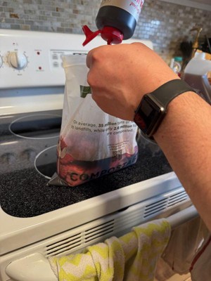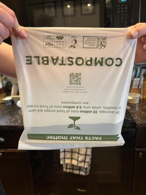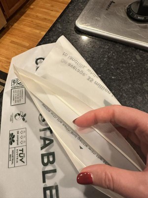These are different than any other composable bags I've tried. For one, they are much thicker, which is really nice. I tried to demonstrate the thickness below with the photos. Typical bags (at least in my experience) are so thin that they sometimes tear before you even get done using them. These haven't done that, at least not while I've been using them. They also come with a press-close top (similar to a sandwich bag), which is really handy (as long as you don't overfill them). You do need to be much more aware how how much you are putting in the bag, because you won't be able to easily seal the bag any other way. The closure itself is pretty sturdy, I didn't have any issues with it. My only other issue is the overall size--we filled these way to fast. But, if you are a smaller family or maybe don't cook as much or something that might not be as much of an issue.