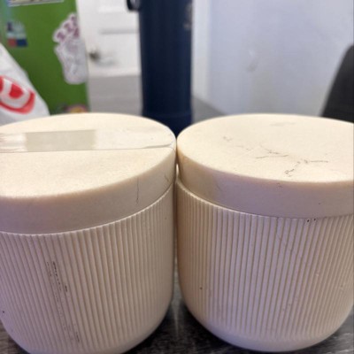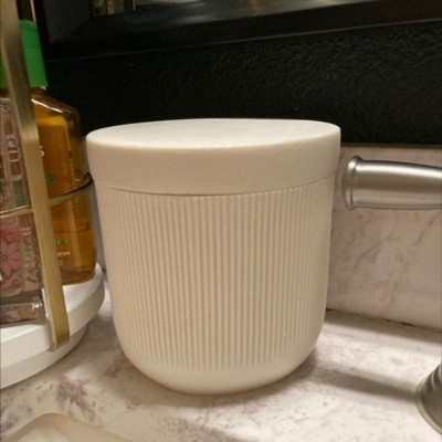 I was looking for a modern and simple bathroom set and found it in this resin canister and matching toothbrush accesories. I like the material (it looks more like a stone material and not resin) and lines of this canister and also that it is large enough to fit cotton pads and/or cotton swabs. I paired it with the white ribbed bath tray made by Room Essentials and everything paired together nicely.