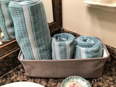 [This review was collected as part of a promotion.] This fabric storage bin is the perfect size to hold extra towels for display in the bathroom. Sits nicely on my bathroom counter. You can actually place almost anything inside(makeup, supplies) . It has handles so you can carry it or move it around easily. It is great to have on hand to store things.