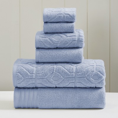 Elevate your daily routine with the perfect balance of beauty, comfort, and performance. Crafted from 100% soft cotton with a zero-twist weave, these towels offer plush, fluffy softness with lighter-weight 550 GSM construction that dries you off quickly without weighing you down. This 6-piece set includes a reversible mix of solid and intricately woven jacquard towels: one solid bath towel, one jacquard bath towel, one solid hand towel, one jacquard hand towel, and two solid washcloths. The yarn-dyed jacquard design adds timeless elegance, while the double-stitched hems ensure lasting durability wash after wash. Certified STANDARD 100 by OEKO-TEX®, this set meets high safety and sustainability standards. Care Instructions: Wash before first use. Machine wash with cold water on a delicate cycle with similar colors. Use mild detergent or neutral soap. Use only chlorine- free bleach if necessary. Do not wring dry, tumble dry on a medium temperature. Iron on low when needed.